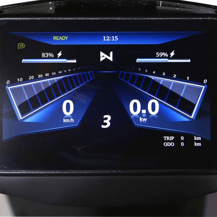 Le LVNENG NCE S est équipé de série de deux batteries lithium-ion amovibles et composées de cellules LG. Elles sont situées sous la selle. Munies d’une poignée de transport et d’un indicateur de charge, elles disposent d’une capacité de 2.44 kWh chacune, pour un total de 4.89 kWh (72V / 34 Ah x 2). Afin de les recharger, le LVNENG NCE S est fourni avec un chargeur rapide d’une intensité de 12A. De 0 à 100%, ce dernier est capable de recharger chacun des batteries en 3h30. Il est compatible avec les prises 220V domestique tout ce qu’il y a de plus classique. Ainsi, vous pourrez recharger chez vous, à la maison. Ou chez des amis, ou au travail. Il sera également possible de recharger depuis les bornes publiques. Pour en savoir plus sur le sujet, vous pouvez consulter notre guide.